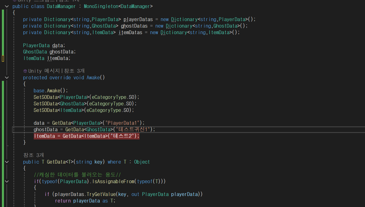 DataManager의 기능은 게임의 전반적인 데이터를 관리하는 역할을 한다면 게임시작시 리소스에 있는 외부데이터(스크립터블 오브젝트, Json)을 불러와서 관리를 해주는 역할이 되어야할 것 같습니다.